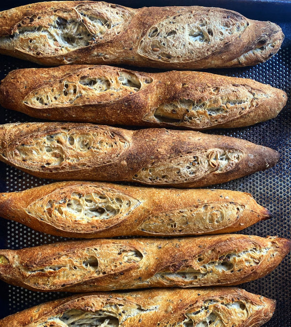Barra de pan elaborada de trigo, agua, sal y masa madre.